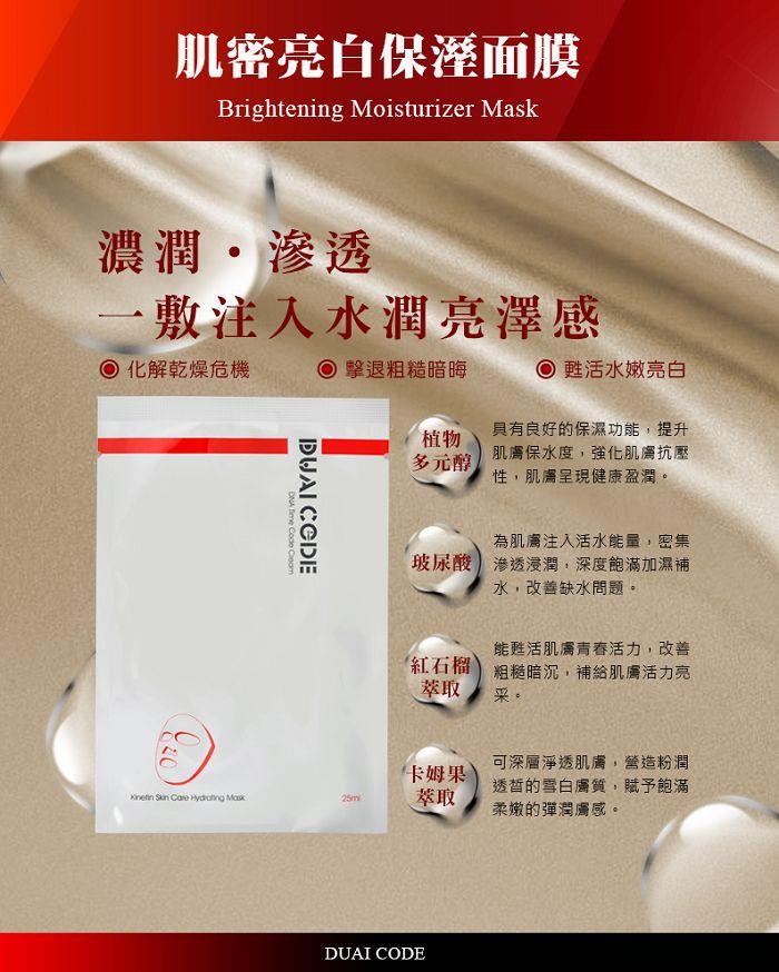 富含飽滿的保濕精華深層滋潤乾燥肌膚 使肌膚彈潤飽滿 品牌定位 開架品牌品牌 DUAICODE水嫩密碼品類 面膜 眼膜功能 保濕 滋潤 美白 淡斑適用部位 臉部適用膚質 全膚質規格 售價:1200