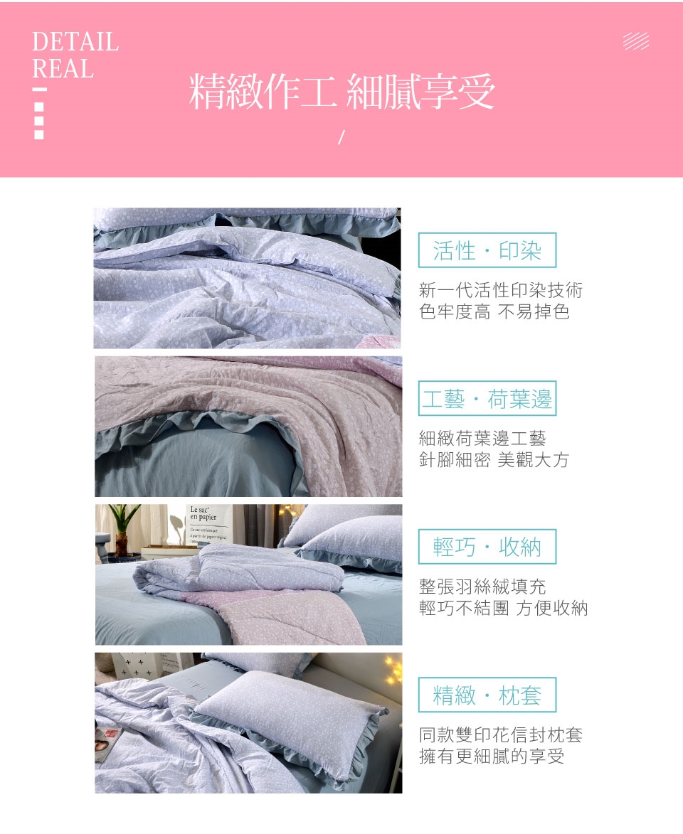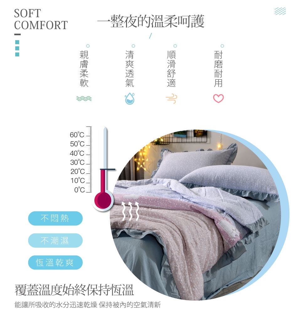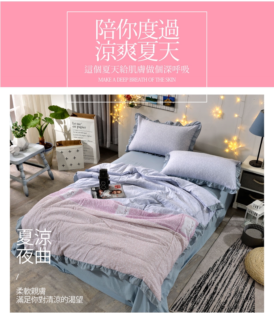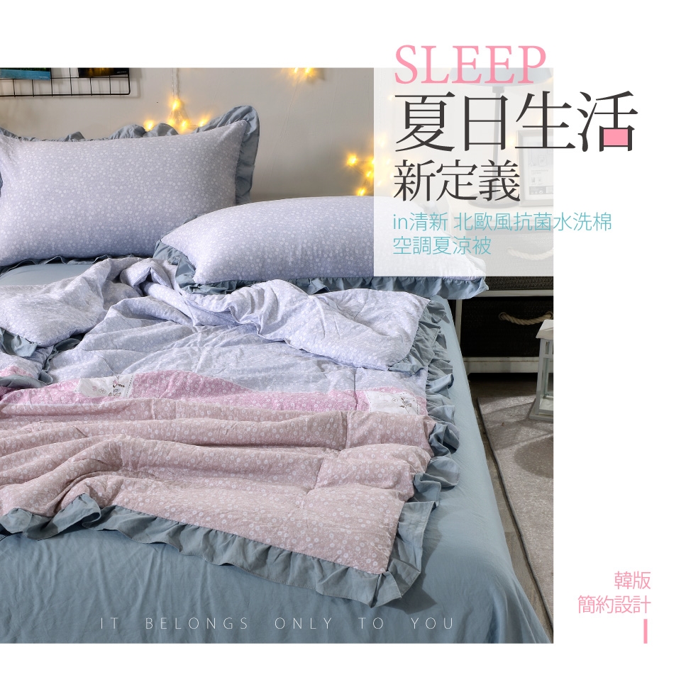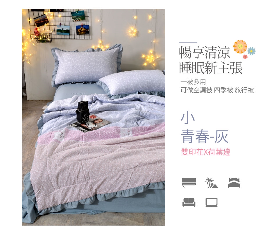 韓款 獨家工藝設計 雙印花X荷葉邊 三道水洗工藝 親膚柔滑 健康無刺激 SGS檢驗合格 寢具公會認證 種類 涼被 四季被材質 聚酯纖維材質說明 表布 底部 100 水洗棉面料 100 售價:549