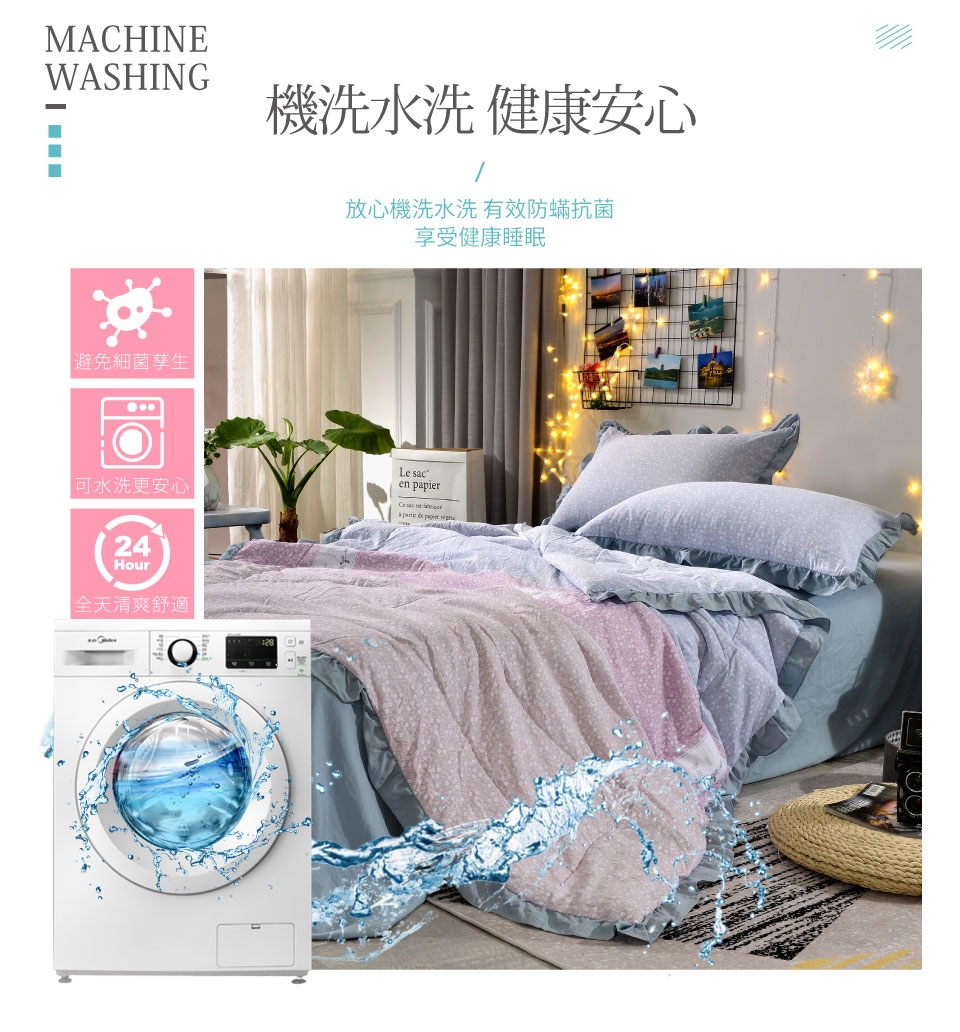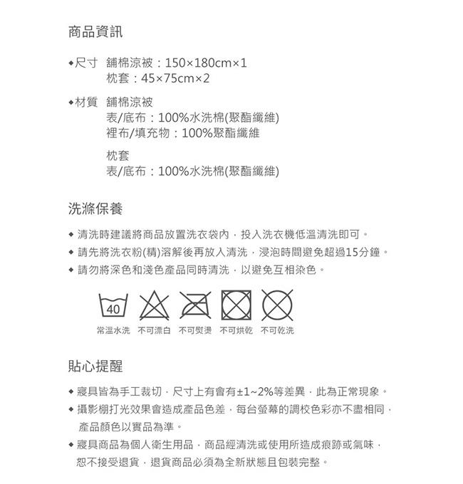 商品規格 種類 : 涼被/四季被 材質 : 聚酯纖維 材質說明 : 表布/底部-100%水洗棉面料(100%抗菌纖維棉) 裡布/填充物:100%聚酯纖維 規格 : 雙人 功能 : 可水洗, 透氣, 吸濕排汗 件數 : 3 尺寸 : 150 × 180 cm 正負3% 體驗說明 使用方法說明 ◆清潔方式-可水洗/不可乾洗/不可熨燙/不可烘乾/不可漂白/使用30℃以下的水溫清洗 /勿使用強力漂白清潔劑or柔軟精/浸泡時間請勿超過20分鐘/建議可放入大型洗衣袋後再清洗 ( 因深色布料請勿使用含漂白劑之洗劑,盡量避免浸泡,深淺色寢具請分開清洗 ) ◆保養方式: 1. 使用前建議將布翻面下水清洗一次,可讓表面的漿質洗掉,使用起來會更加柔軟,也不容易褪色。 2. 建議可將床組放入大型洗衣袋後再清洗,清洗時淺色的要與深色務必分開洗滌,避免顏色互染。 3. 洗滌方式為:先將中性洗滌劑倒入洗衣機,使用水溫不要超過40℃,待洗滌劑完全溶解再放入床包組 注意事項 ◆因本商品屬高單價寢具,收到商品後請確認尺寸及商品狀況無誤後再使用~ ◆產品內容/材質/清潔方式: ◆商品內容: .內容:【FOCA】in清新- 韓款浪漫荷葉邊抗菌水洗輕柔棉空調夏涼被× 1 .材質:表布/底部-100%水洗棉面料(100%抗菌纖維棉) 裡布/填充物:100%聚酯纖維 ◆尺寸: 150 × 180 cm 正負3% 贈品: 枕套尺寸:45 × 75 ,數量X2 .顏色:如圖 / 請參考花色說明圖 (產品可能因拍攝、網頁、螢幕顯示之關係產生些許色差,實品顏色更佳。) .製造:中國 (台商監製/韓國設計) ◆清潔保養方式:可水洗 / 不可乾洗 / 不可烘乾 / 不可漂白。使用前和收藏前,請先置於通風處二小時,每二星期置於通風處陰乾,可以去除放於袋子內的悶味,並保持彈性和蓬鬆度。 ◆本圖片僅供情境圖參考,不含本組單品以外之任何拍攝道具,實際出貨以"商品內容"為主。 ◆注意事項:辦理商品退換貨時,商品如有贈品或配件,麻煩請一併寄回,否則視同缺件無法受理。商品經使用過或是弄髒汙損、損壞,無法接受退換貨。個人衛生用品,如經拆封使用、下水洗滌或拆解以致缺乏完整性及失去再販售價值時,視商品裝況接受退換貨!