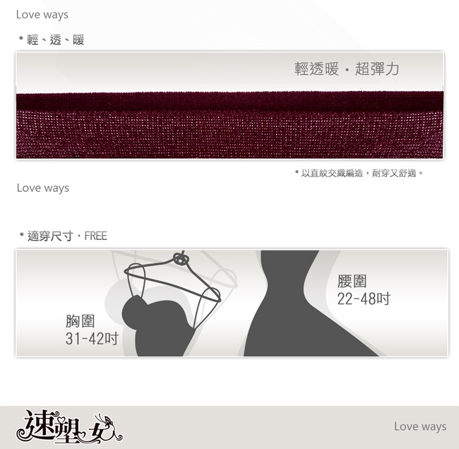 商品規格 ‧主商品:遠紅外線輕薄七分2WAY暖暖衣*4件(經典黑色*2+氣質紅色*1+藏青藍*1) ‧材質:遠紅外線纖維35% .聚酯胺纖維45%.彈性紗20% ‧尺寸: FREE ‧顏色:共同(經典黑/氣質紅/藏青藍) ‧產地:台灣 ‧建議試穿範圍:依胸圍選 FREE(胸圍78-106cm/31-42吋;腰圍55-122cm/22-48吋) ‧洗滌方式: 適宜手洗 不可漂白 不可乾洗 不可烘乾 不可熨燙 陰涼處懸掛晾乾 ‧色牢度:4-5級 ‧縮率:+/-3% 體驗說明 開放其中一件體驗不用還,其他產品退貨時,若有暇疵及人為因素造成之異味.髒污.損壞.恕無法退換貨. 使用方法說明 請先洗滌後再穿 注意事項 深淺色衣物請分開洗滌