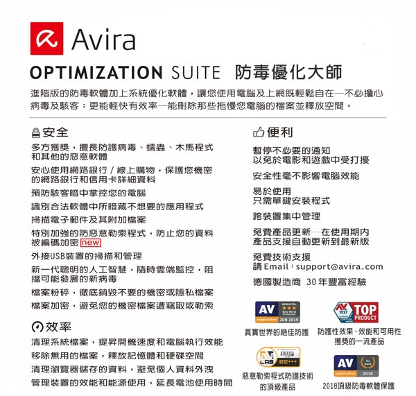 特別加強的防惡意勒索程式 讓您安全的上網 購物和交易 清理優化加速您的電腦 品牌 AVIRA小紅傘類型 防毒軟體型式 盒裝版軟體形式 序號卡 下載語言 中文適用裝置 桌上 售價:1080