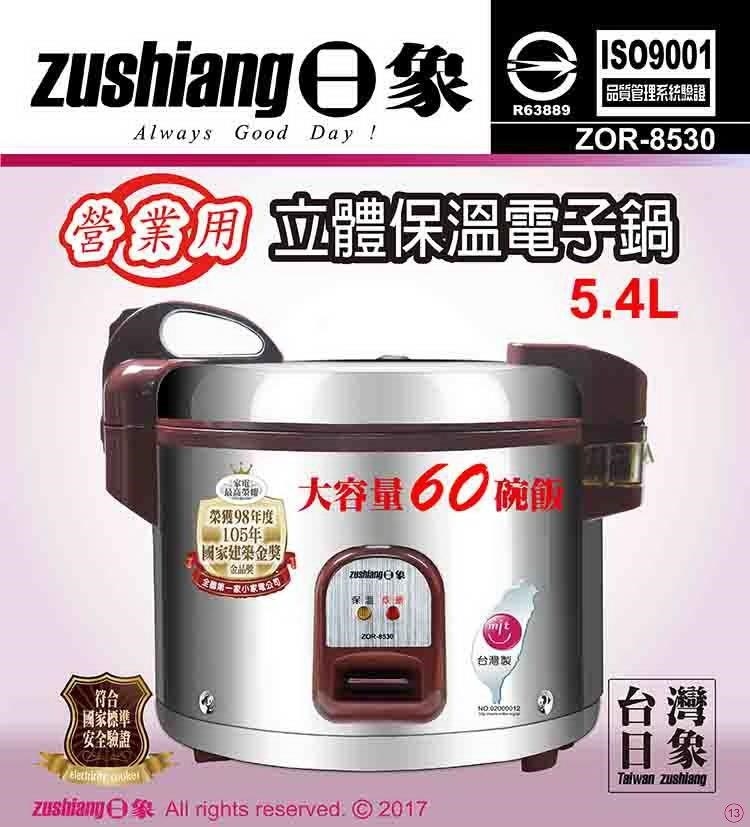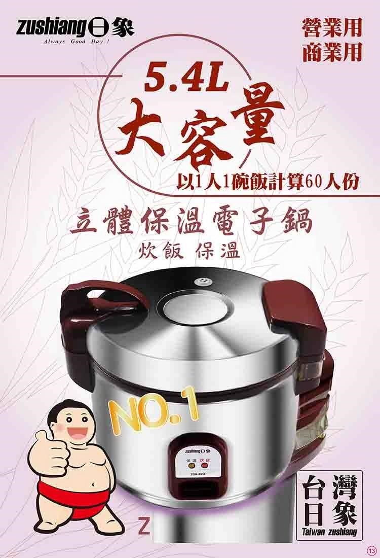 營業用 商業用 炊飯 立體保溫 5 4L超大容量約60碗飯 商品名稱 日象 5 4公升炊飯立體保溫電子鍋 60碗飯 ZOR 8530品牌 Zushiang日象種類 電子鍋型號 ZOR 8530容 售價:8900