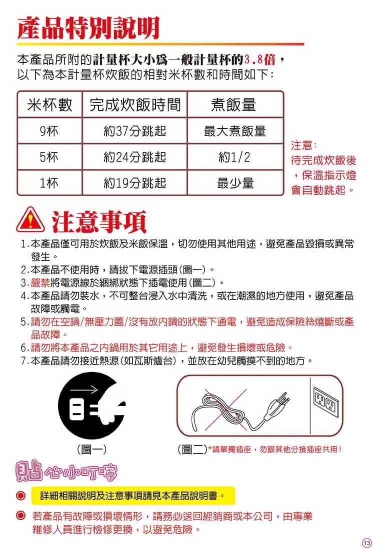 商品規格 商品名稱 : 【日象】5.4公升炊飯立體保溫電子鍋(60碗飯) ZOR-8530 品牌 : Zushiang日象 種類 : 電子鍋 型號 : ZOR-8530 容量範圍(人份) : 20人份以上 實際容量(人份) : 60人 外鍋材質 : 不鏽鋼,塑膠 內鍋材質 : 不鏽鋼 特色 : 保溫, 營業用, 可拆洗內蓋 產地 : 台灣 電壓 : 110 V 頻率 : 60 Hz 消耗功率 : 1450 W 外包裝尺寸 : 460 x 460 x 420 mm 本體尺寸 : - 本體重量 : 9.7KG 配件 : - 保固 : 一年 注意事項 : 以上資料與圖片僅供參考!規格及隨機標準配備以實際出貨為主,如有錯誤或不符者,將不再另行補寄或更換,謝謝! 體驗說明 使用方法說明 無 注意事項 商品到貨享十天猶豫期之權益(注意!鑑賞期非試用期),辦理退貨商品必須是全新狀態且包裝完整,否則將會影響退貨權限。