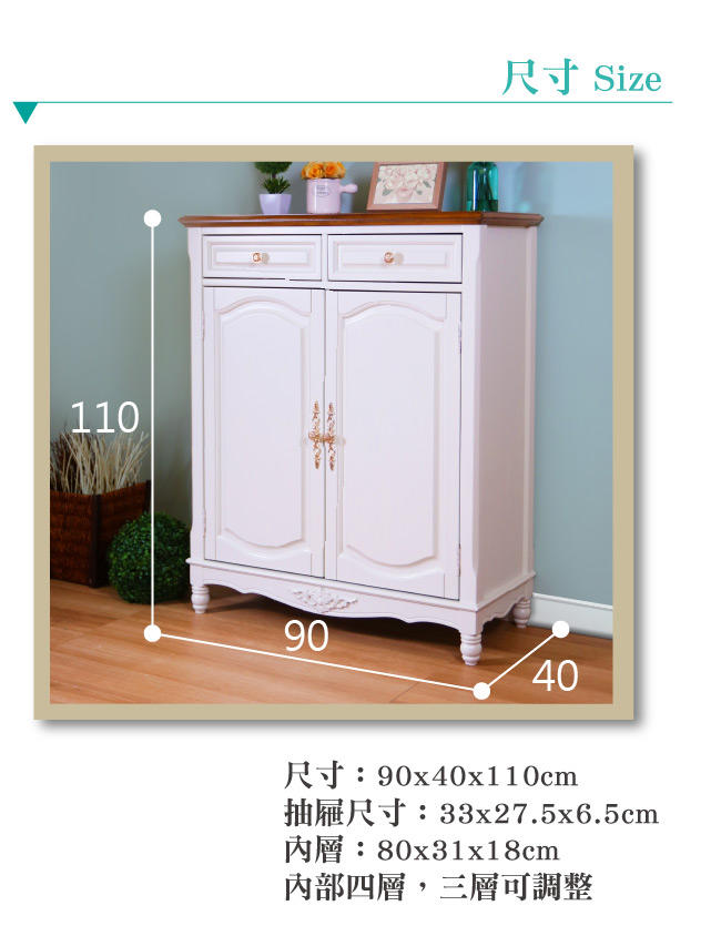 精緻 時尚把手設計 雙抽雙門設計 簡單美觀 內部四層收納 三層隔板可調 顏色 白色 木 白材質 實木 密集板尺寸 90x40x110cm 售價:11900